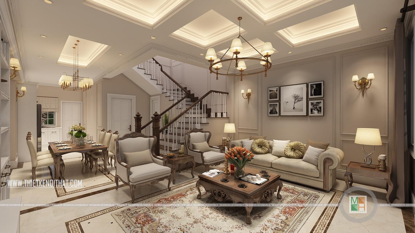 Tuy nhiên, thay vì lấy điểm nhấn là ánh sáng, và cảm giác tươi mới, kiến trúc sư lại khéo léo chuyển hướng sự chú ý của gia chủ đến đường nét và cảm giác ấm áp và căn nhà đem lại. Ngoài ra, thiết kế tủ đứng đường như đồng nhất với tường vừa đảm bảo tính công năng của đảm bảo tính thẩm mỹ và phần nào giúp mở rộng không gian. Thiết kế tường bao quanh sử dụng các trang trí nhẹ nhàng để tránh gây cảm giác nhàm chán và thể hiện đồng bộ nét cổ điển của cả căn nhà. Sự kết hợp của đường nét trên các thiết kế tủ gỗ, kệ, tường hay sofa tuy đều là những chi tiết thiết kế tạo điểm nhấn và khắc họa rõ ràng phong cách tân cổ điển.